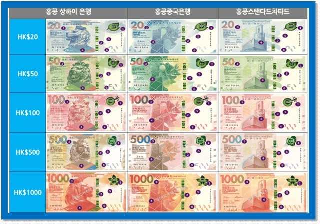 홍콩 지폐 종류로는 ➊$10, ➋$20, ➌$50, ➍$100, ➎$500, ➏$1000 총 6개 단위의 지폐가 있다.